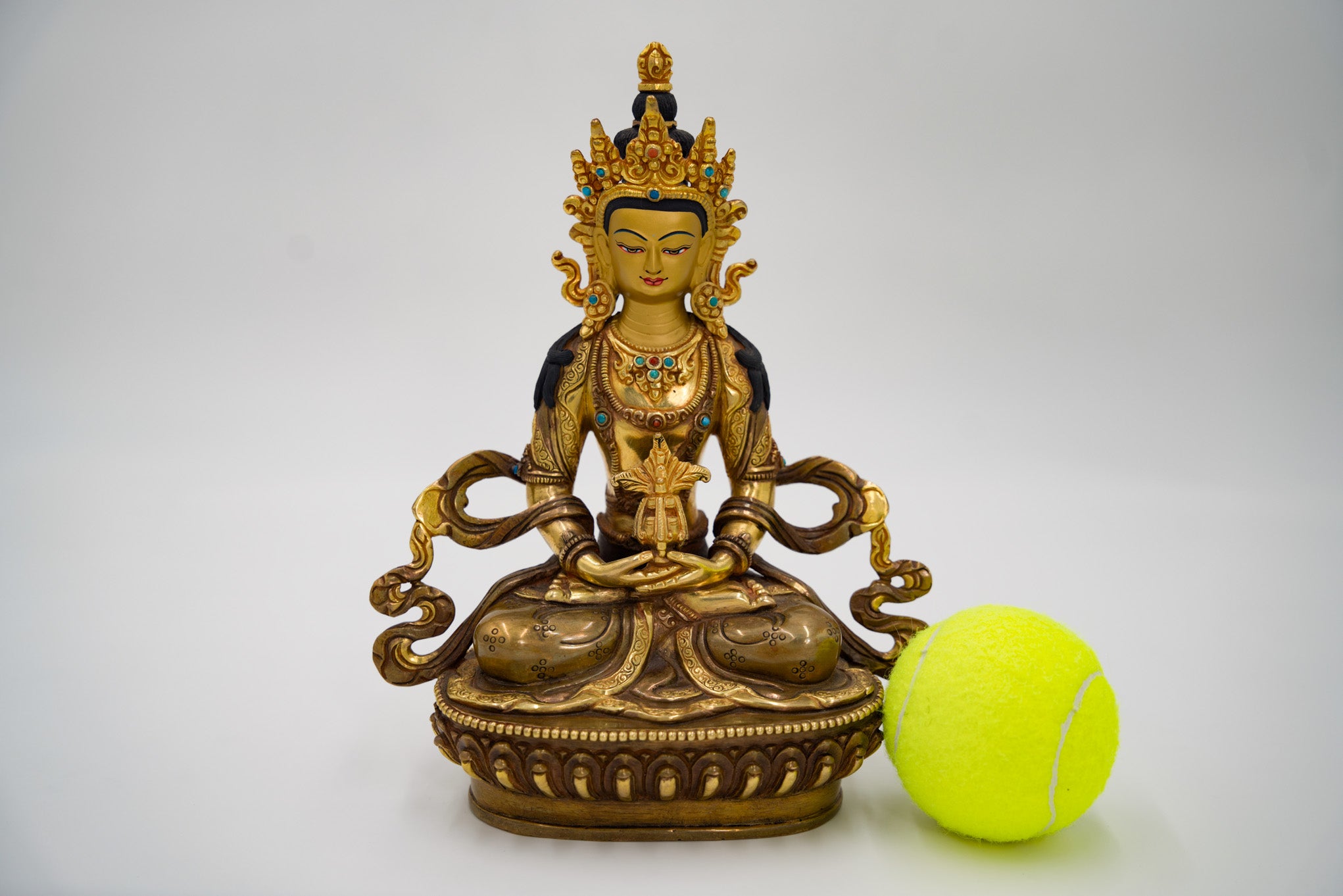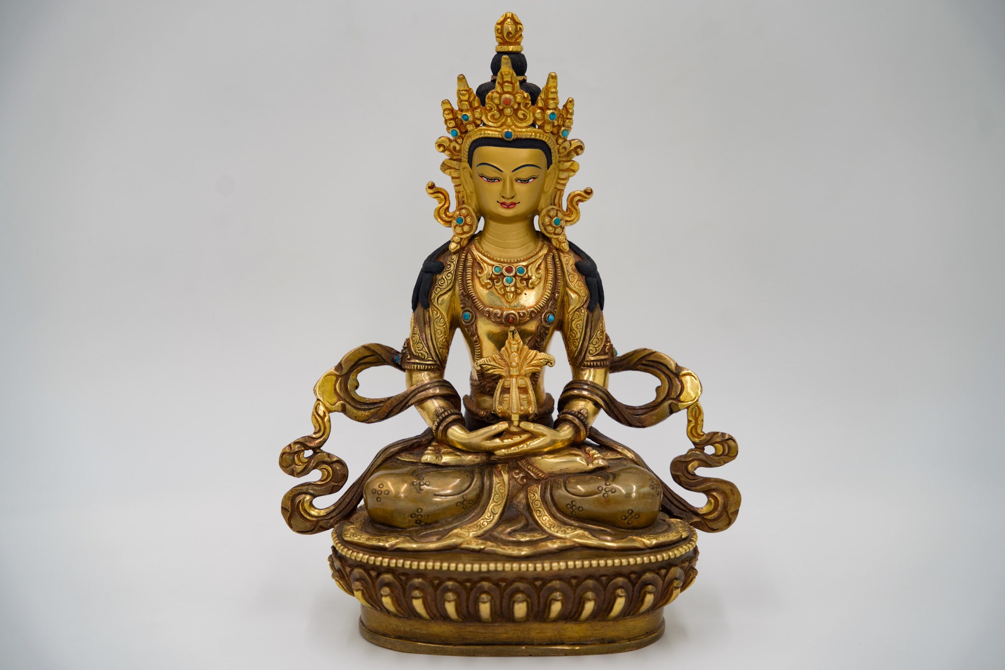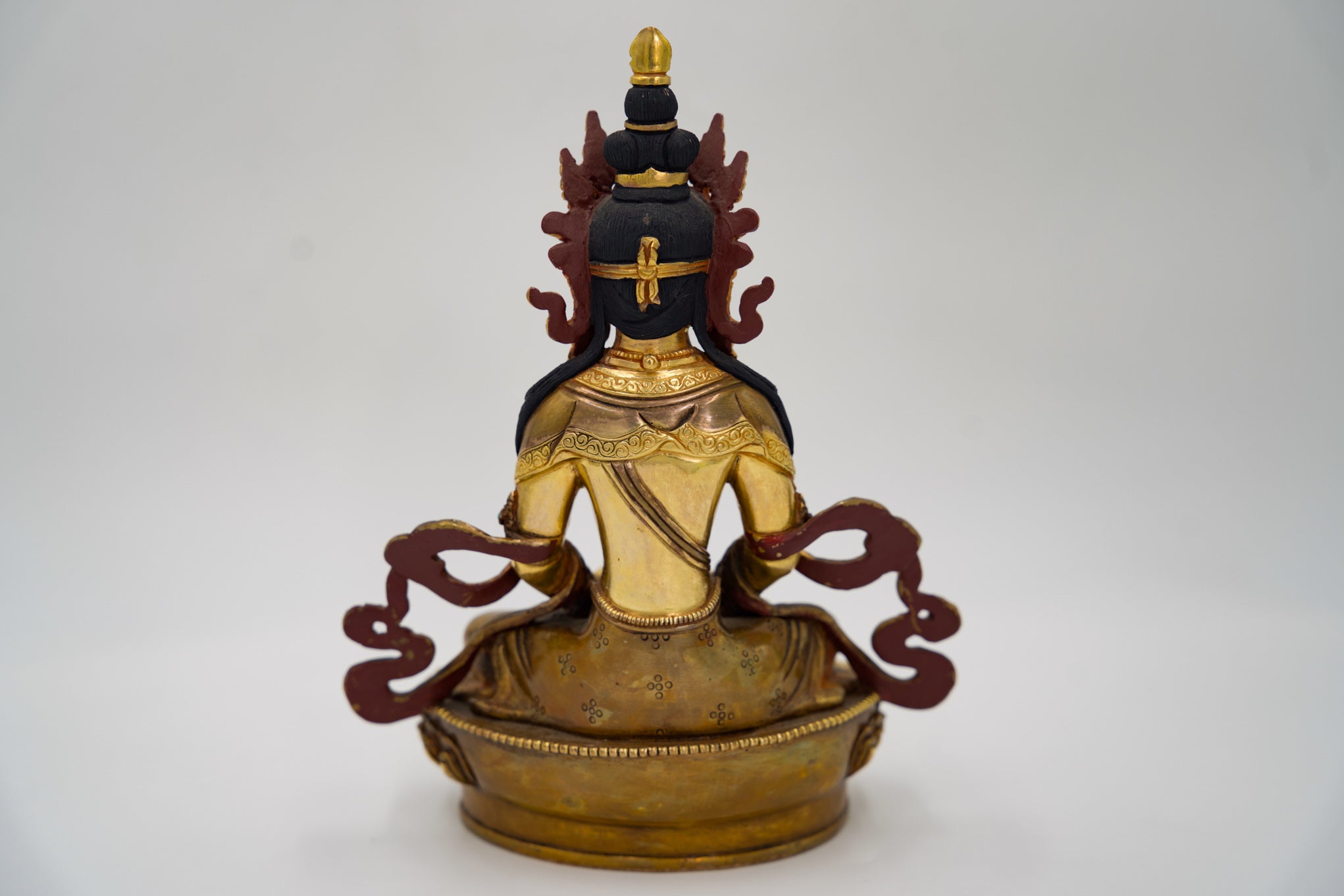 Crafted in Nepal using the lost-wax method, this Amitayus statue features a 24k part-gold two-toned finish. The surface presents a mixture of dark chocolate and lighter brownish finishes, while 24k mercury gilding highlights the intricate engravings on the robe borders. The face is painted using melted gold.