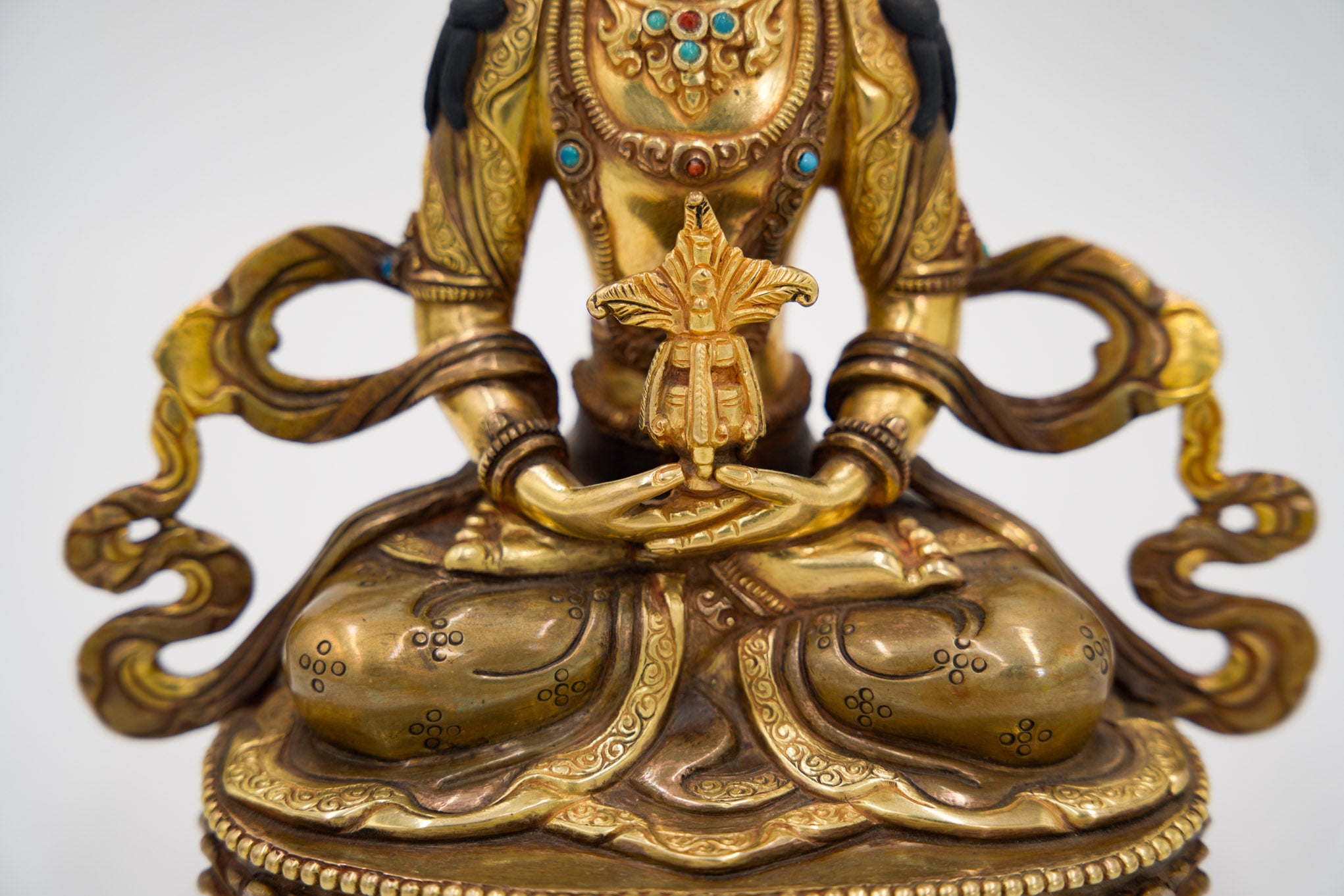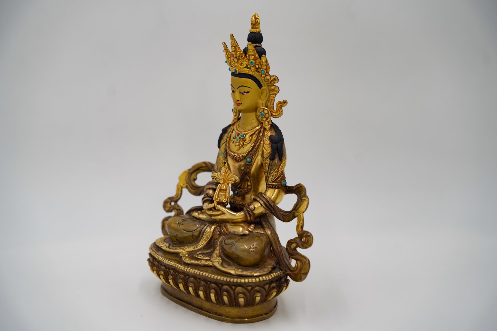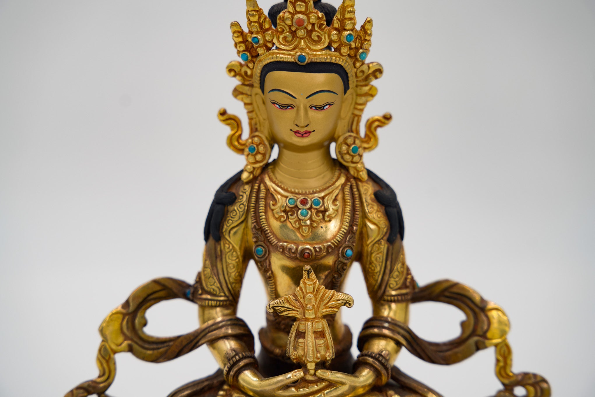 Crafted in Nepal using the lost-wax method, this Amitayus statue features a 24k part-gold two-toned finish. The surface presents a mixture of dark chocolate and lighter brownish finishes, while 24k mercury gilding highlights the intricate engravings on the robe borders. The face is painted using melted gold.
