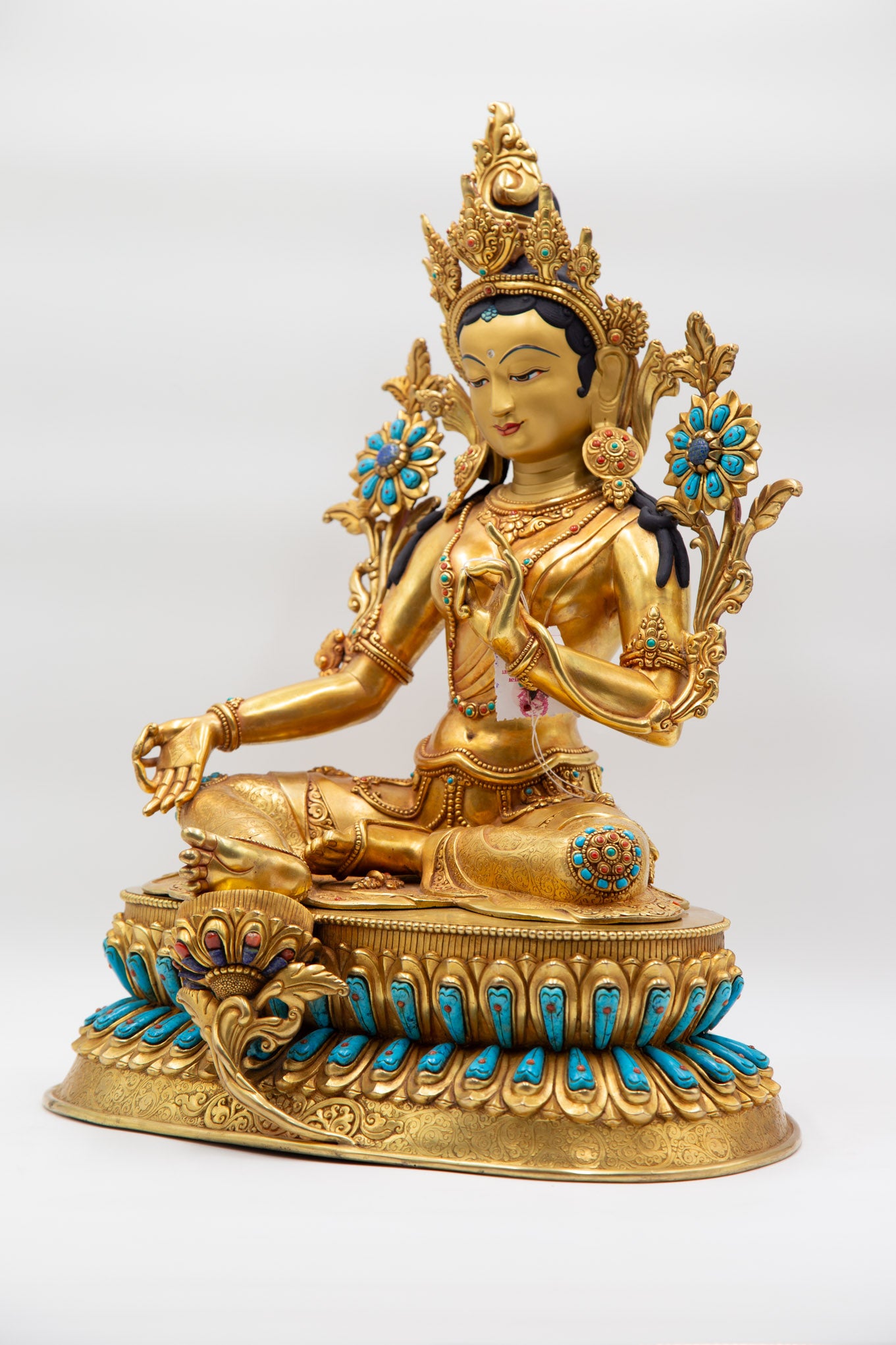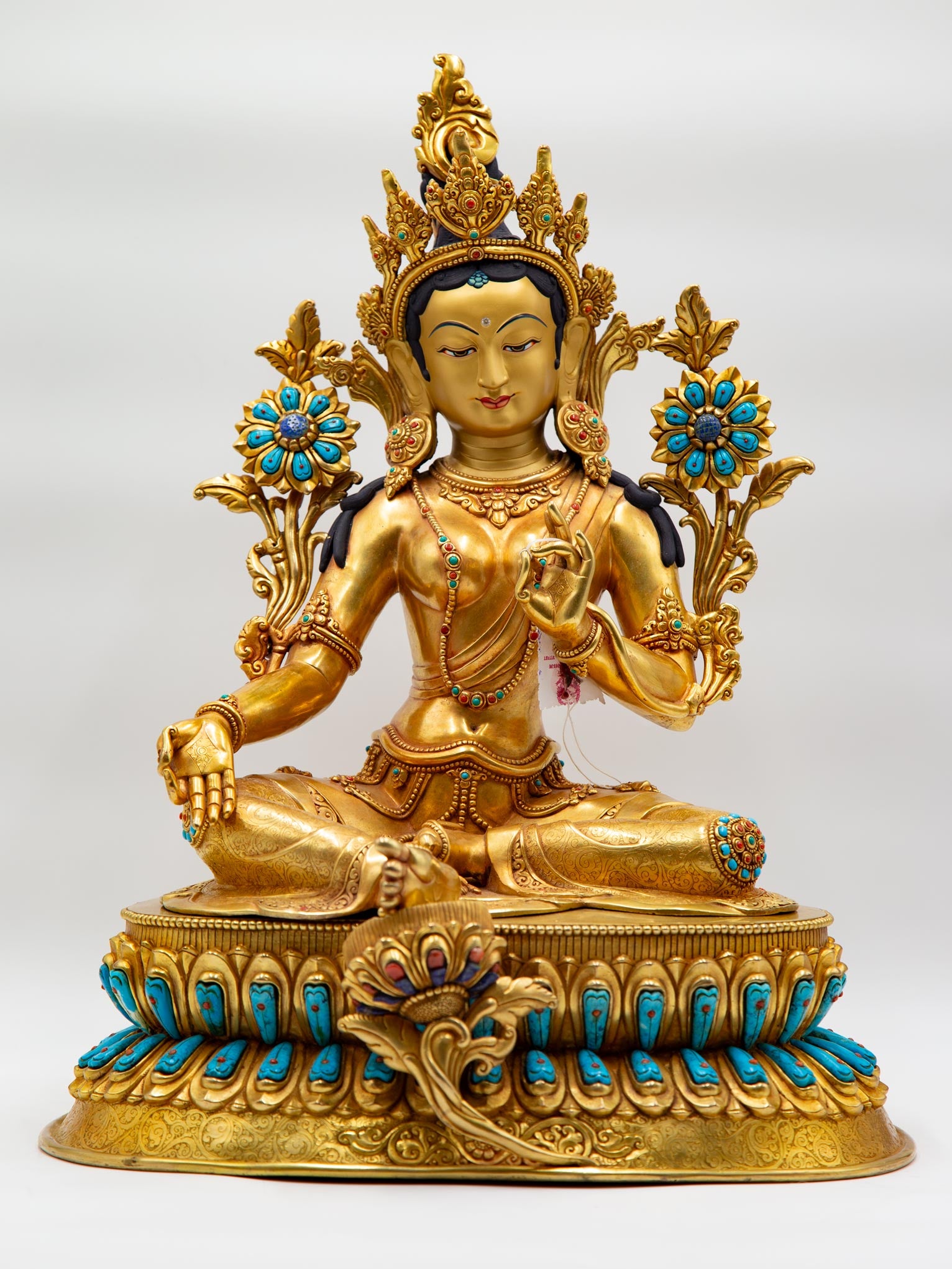 Crafted in Nepal using the lost-wax method, this copper Green Tara statue is fully gilded in 24k gold. The figure is richly adorned with hand-set turquoise, coral, and lapis lazuli stones accenting the crown, jewelry, and lotus flowers. High-depth engravings texture the robes and base, while the face is painted in gold with precise details.
