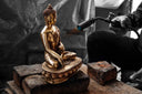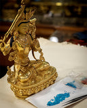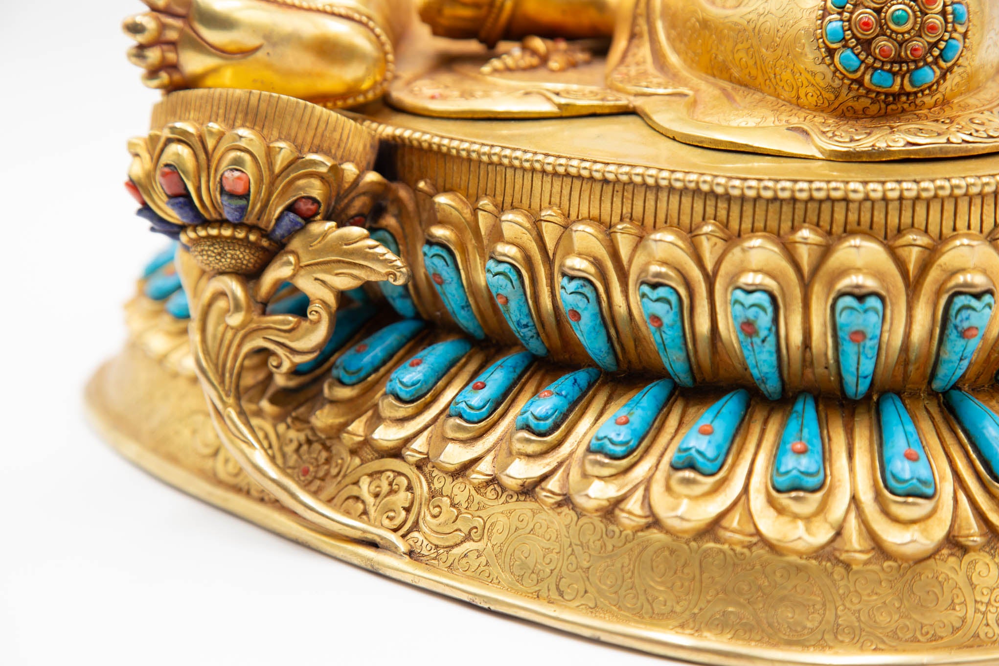 In this final stage, called fwo thu-nui, turquoise stones are set into the statue’s jewelry. After this, the statue is complete and ready to be blessed before being placed on a practitioner’s shrine.
