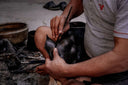 In this stage, called dhale yaigu, the replicated wax figures are coated with layers of sand mixed with cow dung. After heating the mold, the wax melts out through an opening. Molten copper is then poured in, filling the space left by the wax. Once cooled, the mold is broken to reveal the raw metal figure.