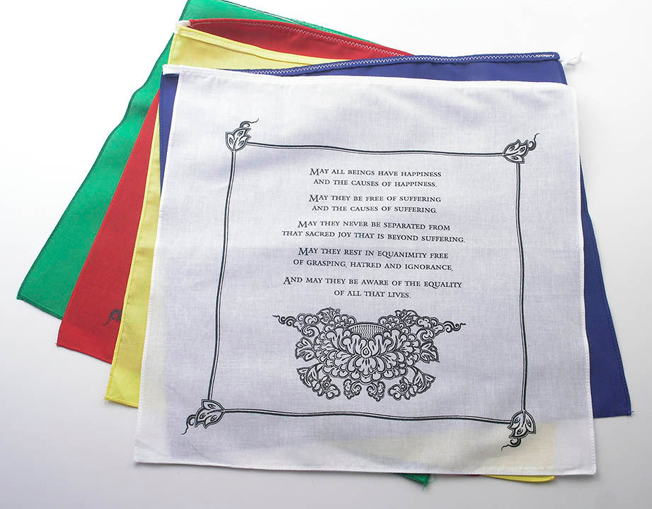 Set of 5 flags, multicolored ~ approximately 7.5 ft long including string. Individual green flag also available. Printed with high quality inks on durable cotton/polyester fabric. Made in the U.S.A., each flag measures 15" x 15".