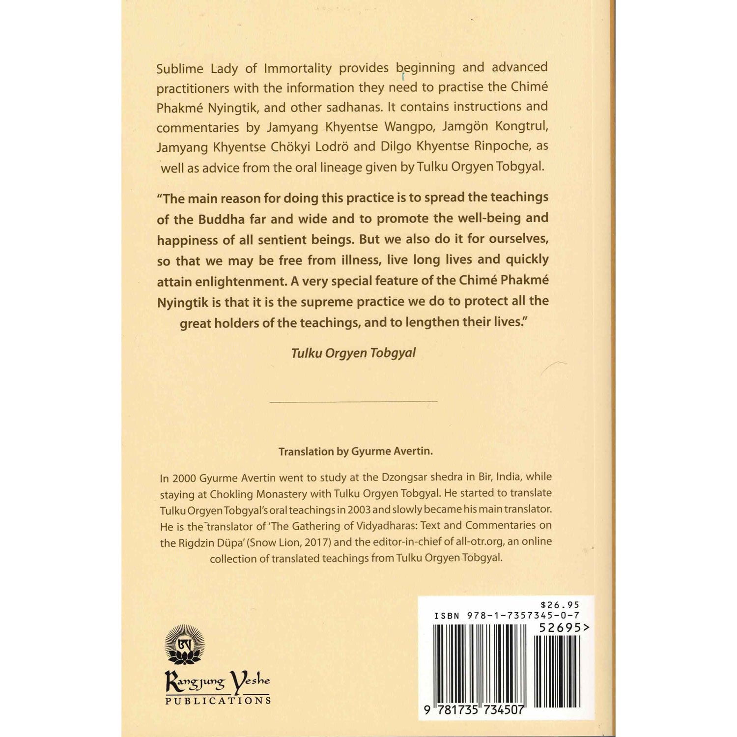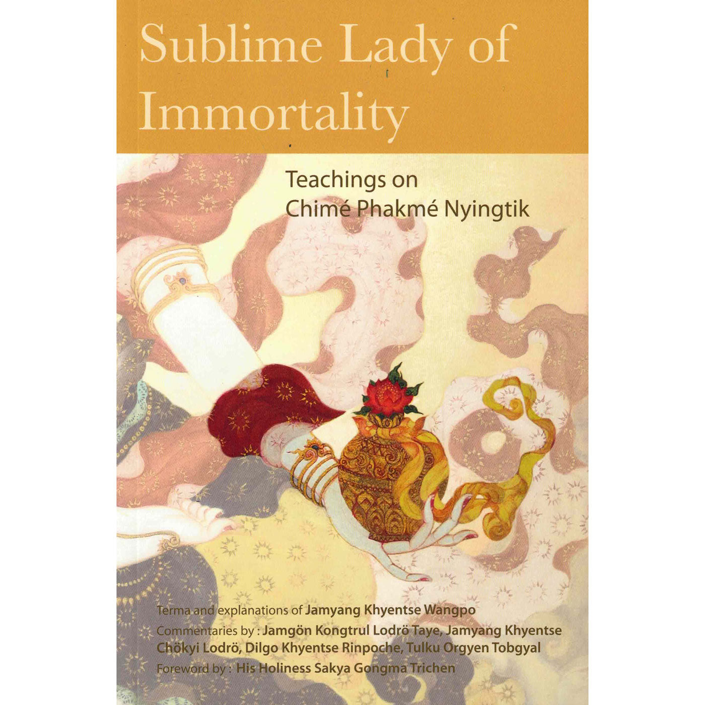 The Heart Essence of the Lady of Immortality or Chime Phakme Nyingtik is the most profound of all the teachings that Jamyang Khyentse Wangpo received through the seven methods of transmission, because not only does it bring about a long life, but a life that is free of obstacles. It also causes wisdom to blossom and is said to have the most blessings. Sublime Lady of Immortality – Teachings on Chime Phakme Nyingtik contains the translation of all the texts by the great masters of the Chime Phakme Nyingtik lineage. It contains Jamyang Khyentse Wangpo’s answers to questions about the Chime Phakme Nyingtik, Jamgön Kongtrul’s Retreat Manual, Jamyang Khyentse Chökyi Lodrö’s practice instructions, and Dilgo Khyentse Rinpoche’s short visualization guide. It also contains the instructions from the oral lineage as taught by Tulku Orgyen Tobgyal in a series of eleven teachings. All these teachings, everything you find in this book, reveal the profound views, powerful meditations, sacred conduct, and ultimate goals of the Vajrayana teachings of Tibetan Buddhism.